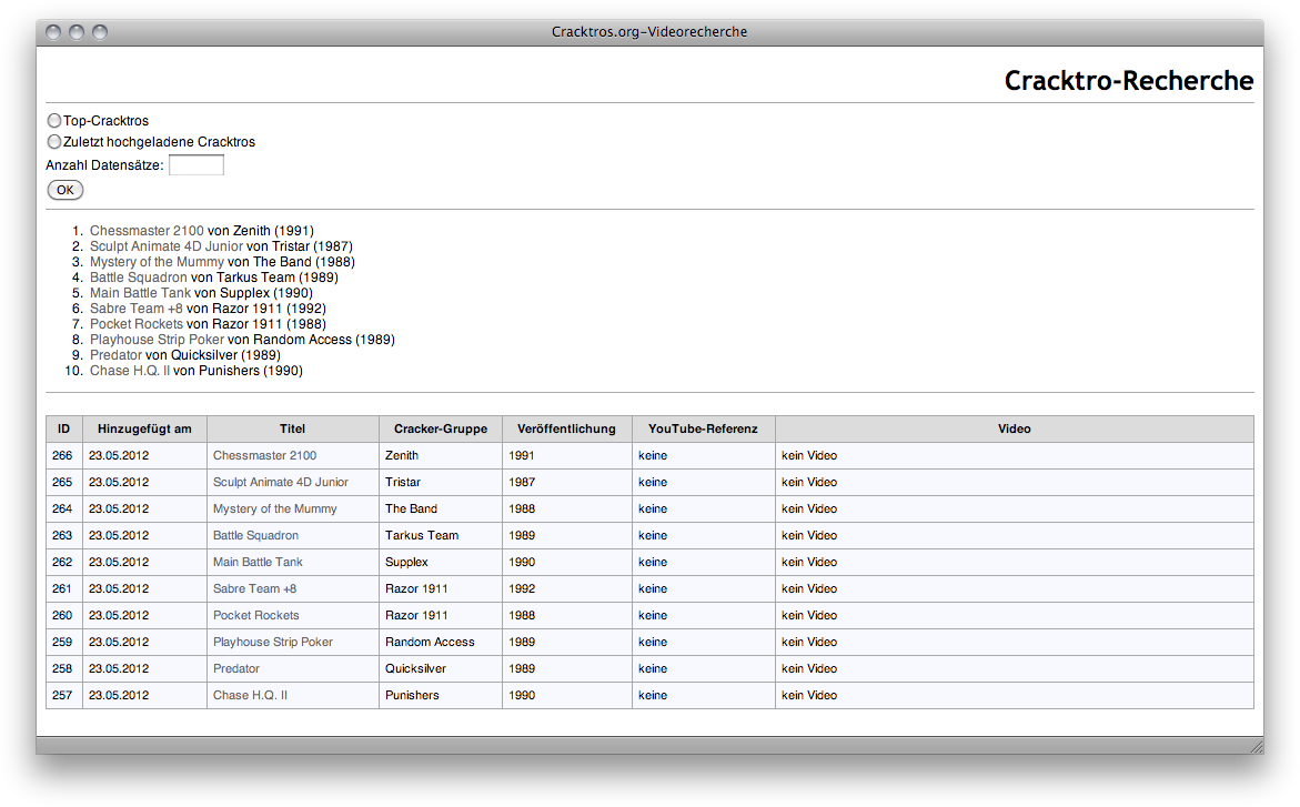 ein Tool zur Cracktro-Recherche, das per JSON-Stream auf eine entfernte MySQL-Datenbank zugreift.