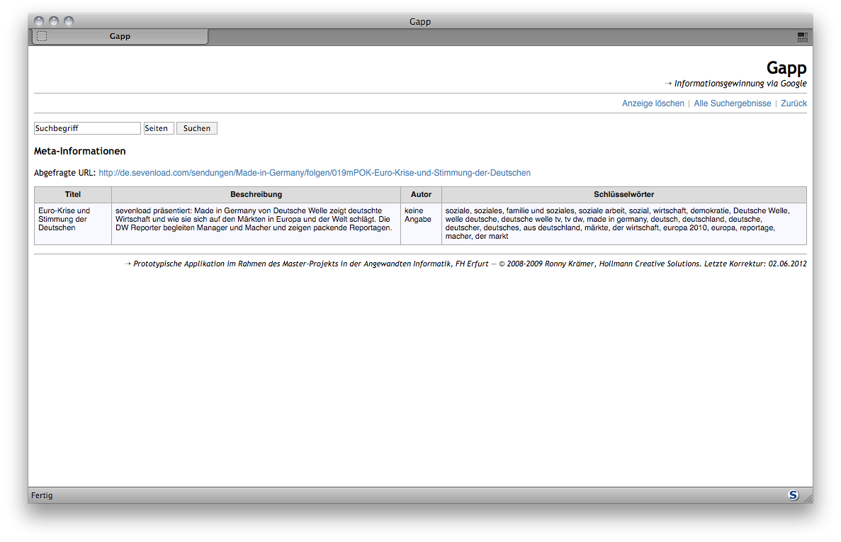 auswertbar wiederzugeben. Im aktuellen Entwicklungsstand bedient sich Gapp der Google AJAX Search API,