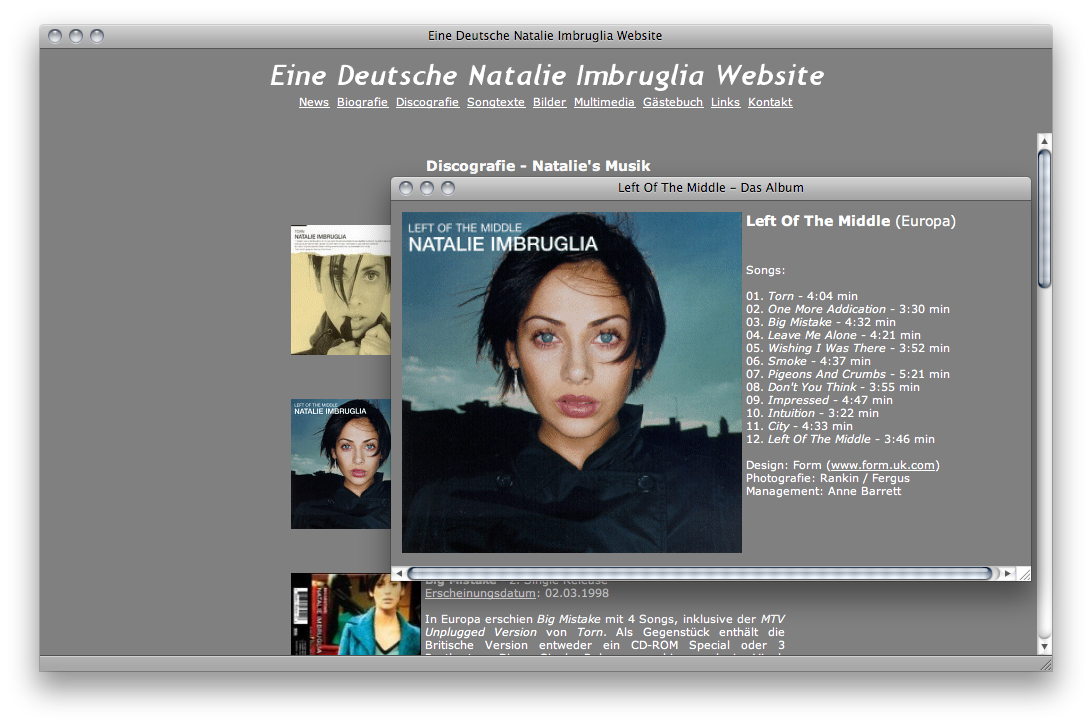 Eine andere Website (2001) widmete ich zusammen mit einem Freund der Sängerin Natalie Imbruglia. Meine erste bezahlte Auftragsarbeit war eine Homepage über die