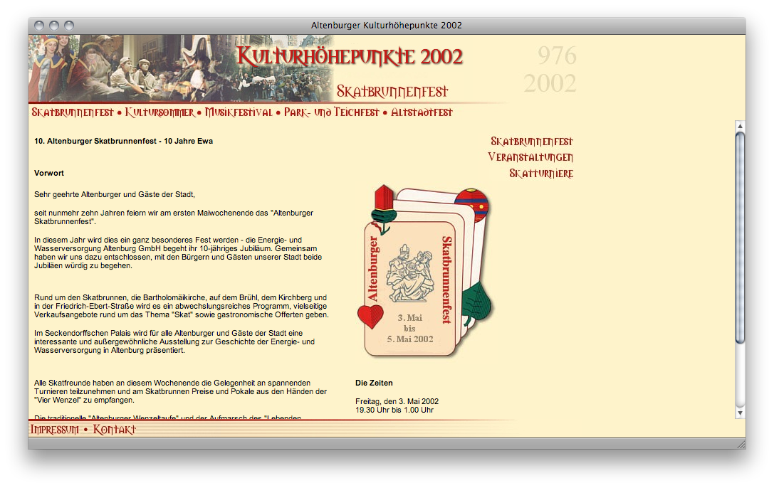 die städtischen Internetseiten komplett neu und verwirklichte Einzelarbeiten wie das Online-Buchungsverzeichnis oder die Kulturhöhepunkte 2002, die mir nach heutigen Gesichtspunkten